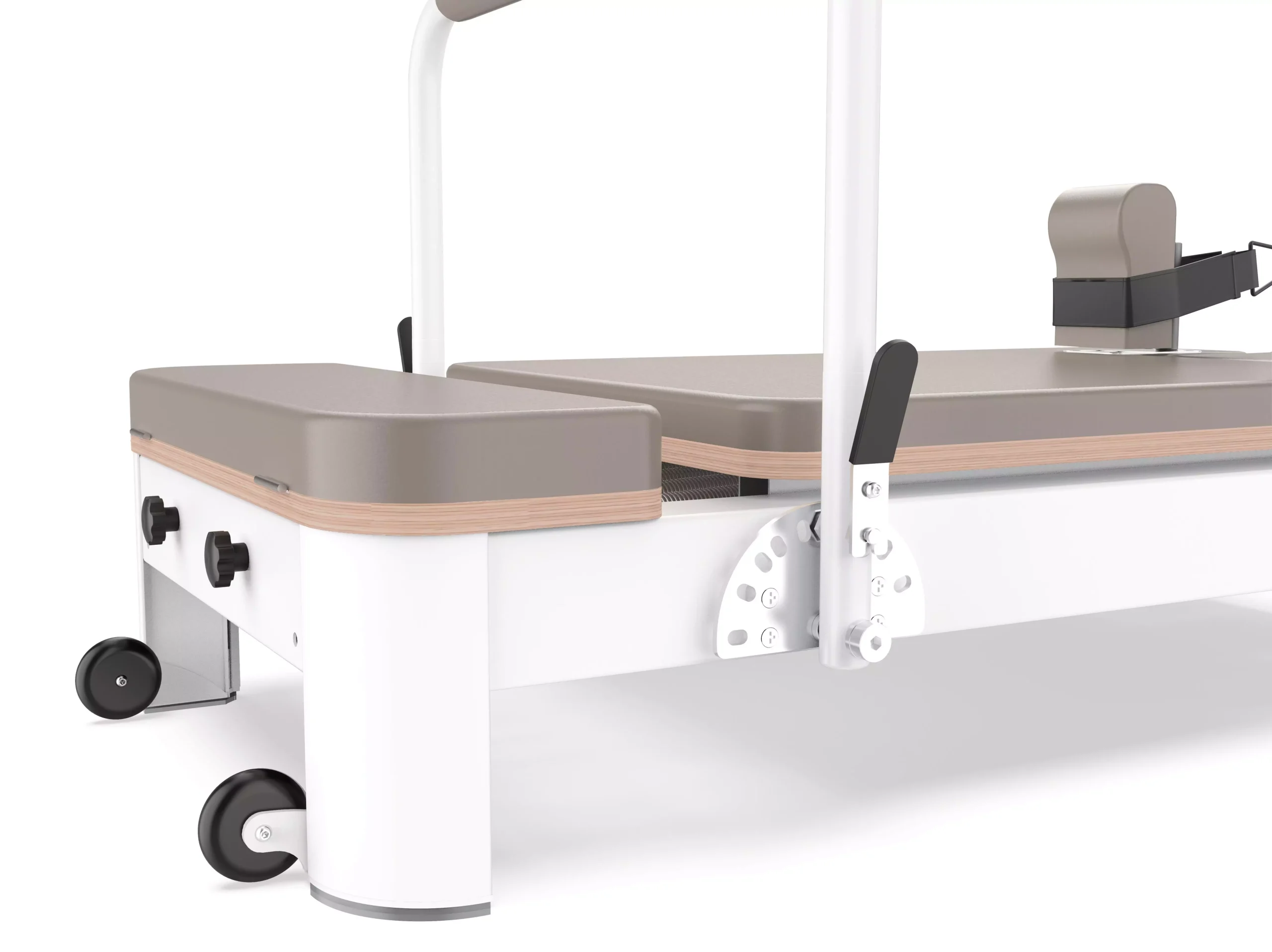 Reformer do Pilatesu PTX7000 Moon&Sand Toorx Liveness to reformer klasy S do intensywnej pracy w studiu i zastosowań komercyjnych. Aluminiowa konstrukcja, wózek na 8 kółkach Poliuretanowych z łożyskami oraz regulacja drążka na stopy poza ramą (9 poziomów kątowych) zapewniają płynność ruchu, stabilność i ergonomię. Model jest składany na pół i może być przechowywany pionowo – idealny do sal, w których liczy się każdy metr.