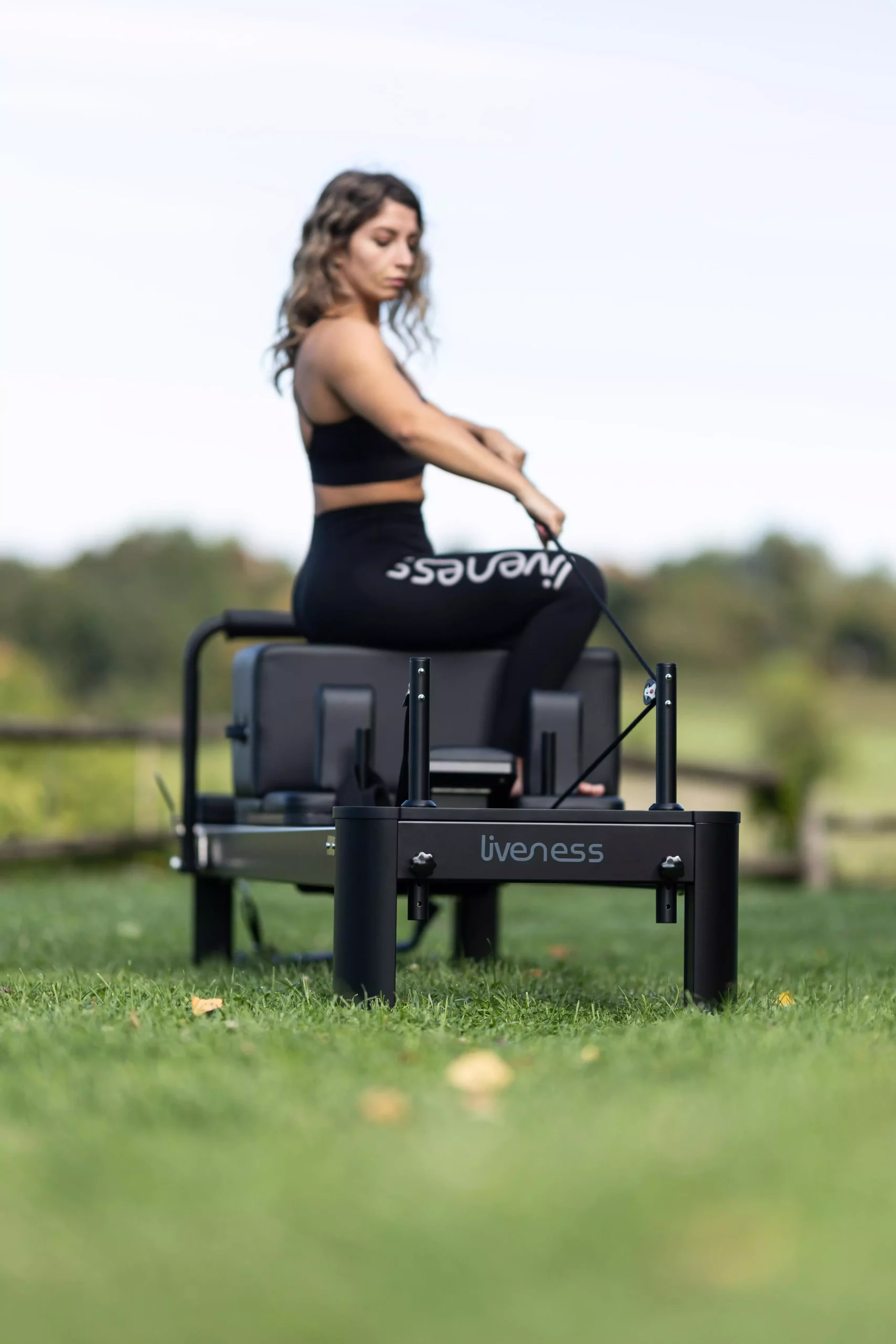 Reformer Toorx Liveness PTX7500 Black Pearl to reformer klasy S przeznaczony do intensywnego użytku komercyjnego i studyjnego. Dzięki solidnej aluminiowej ramie, wózkowi na 8 kółkach Poliuretanowych z łożyskami tocznymi oraz nowoczesnemu systemowi regulacji drążka na stopy, urządzenie zapewnia płynność ruchu, ergonomię i bezpieczeństwo.