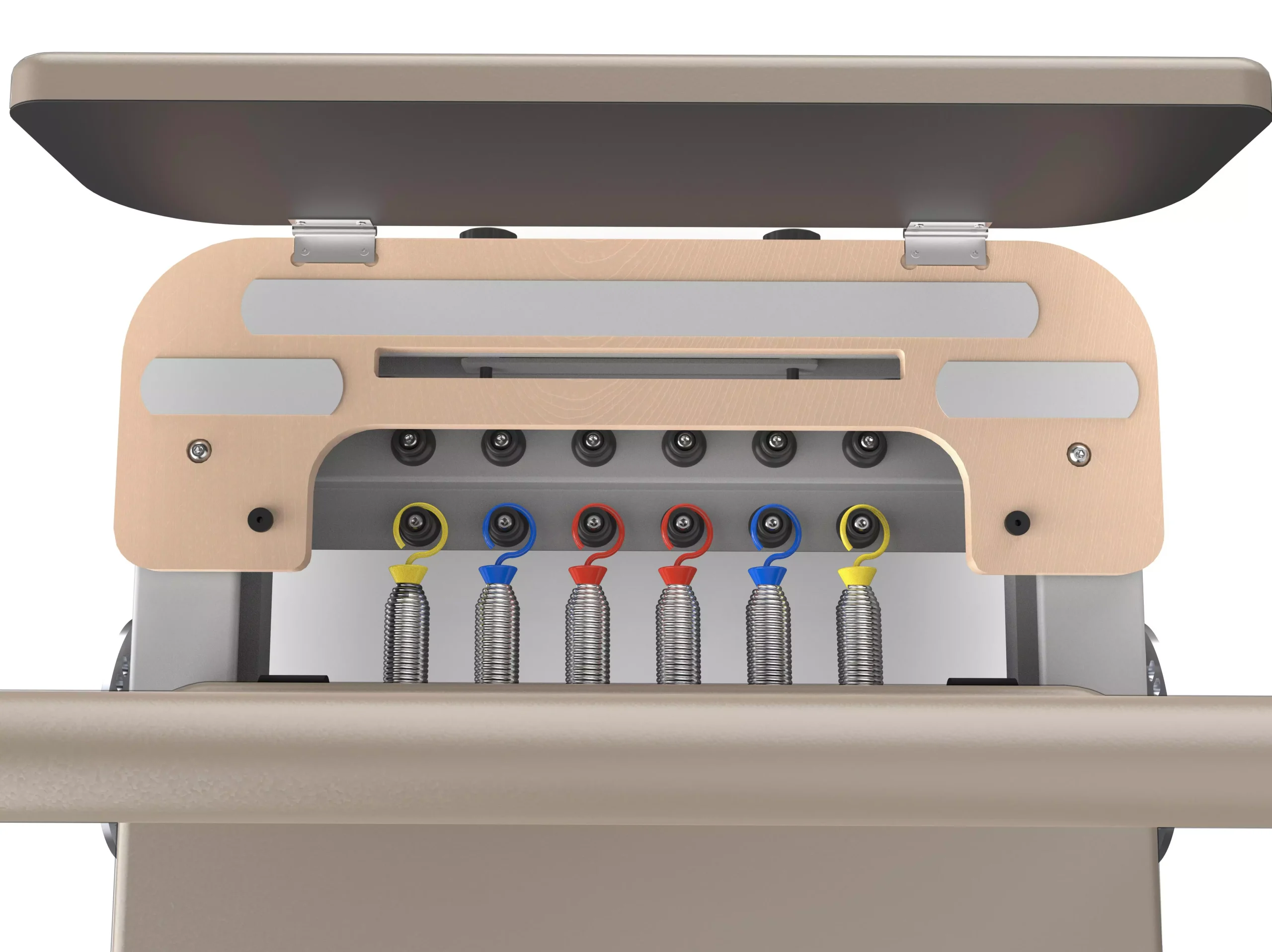 W standardzie znajduje się automatyczny system lin, uchylna platforma antypoślizgowa, a także komplet akcesoriów: box i jumpboard. Reformer pozwala na trening zgodny z naturalną biomechaniką i spełnia rygorystyczne normy EN ISO 20957 (klasa S).